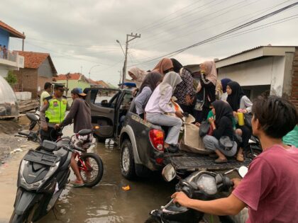 Banjir Rob Tak Kunjung Surut, Polsek Losari Antar Siswa Sekolah dengan Mobil Patroli