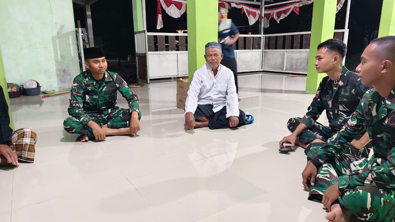 Para personel Satgas TMMD nampak duduk melingkar dan berbincang hangat dengan Tokoh Agama (Toga) setempat, Bapak Abdul Hamid (65), yang juga menjabat sebagai Ketua Ta’mir Mushola Riyadhul Huda.
