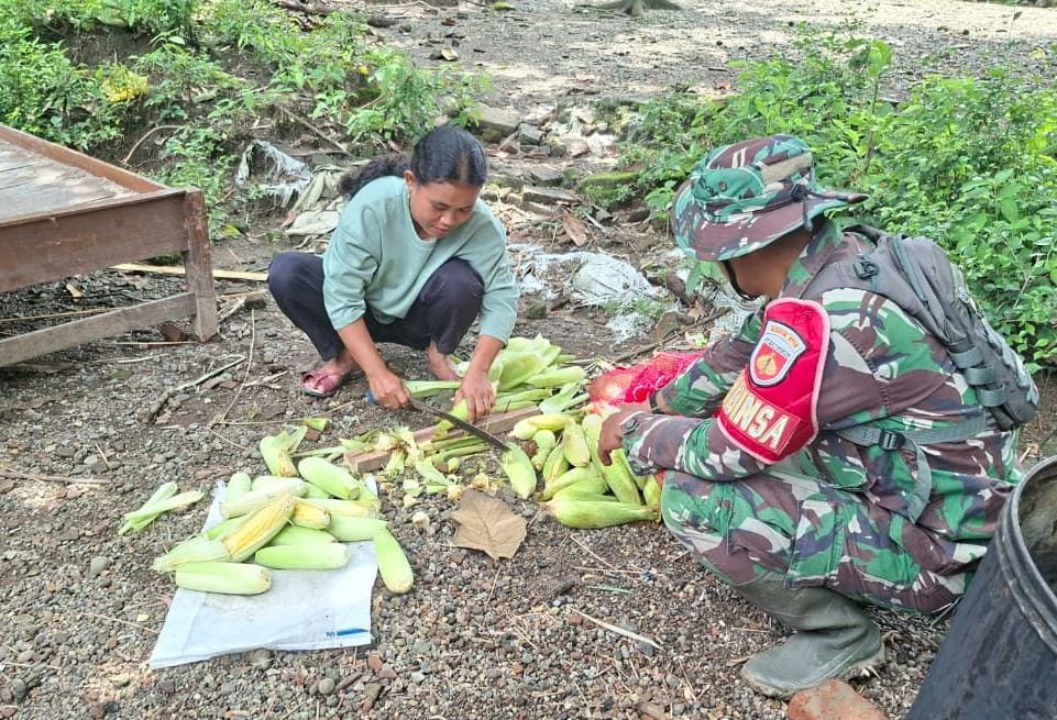 “Ini hasil kebun sendiri, kami bersihkan dan rebus bersama-sama untuk bapak-bapak TNI yang sudah capek membangun desa kami. Ini bentuk terima kasih kami yang sederhana,” ujar Ibu weni sembari mengupas kulit jagung.