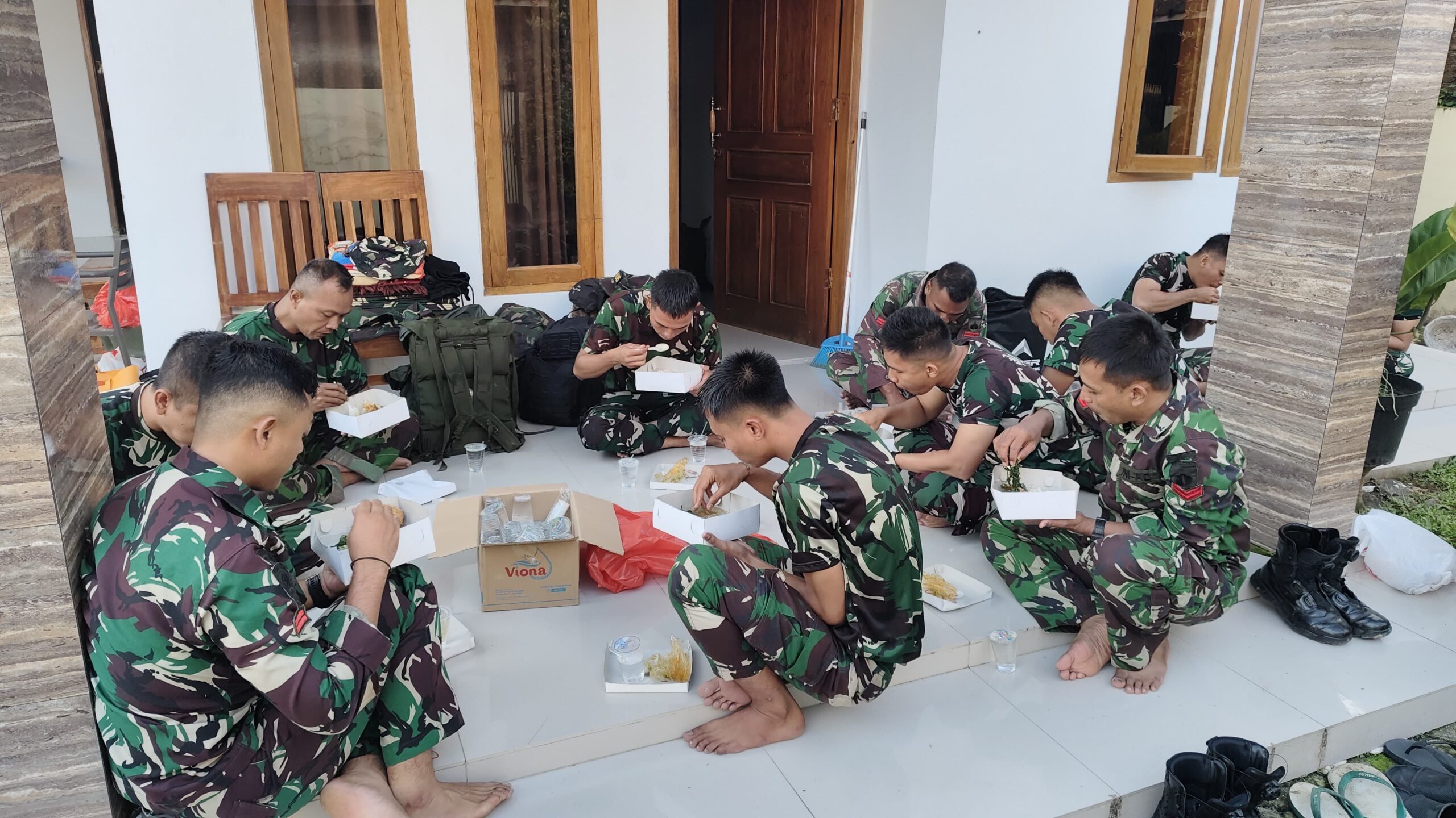 Tampak terlihat para anggota Satgas sedang sarapan pagi di rumah bapak Miftahul (35) yang satgas menginap.
