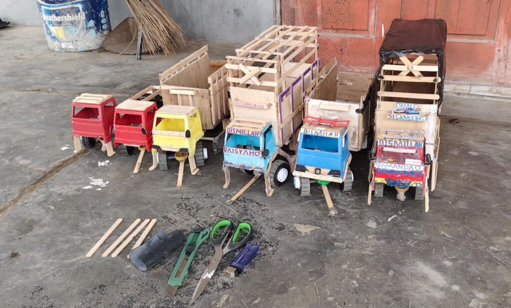 Pemandangan penuh keakraban ini terjadi di pelataran rumah warga. Dengan memanfaatkan bahan-bahan sederhana yang ada di sekitar, Serka Bangun dengan sabar membimbing jari-jemari mungil anak-anak Desa Cikuya untuk merakit mainan kreatif.