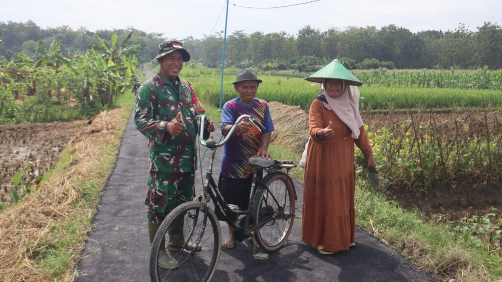 Serka Sagiman, Babinsa Koramil 14/Banjarharjo yang juga anggota Satgas TMMD, tampak menyapa ramah pasangan suami istri, Bapak Tarno (60) dan Ibu Umi (55), yang sedang melintasi jalan aspal baru tersebut dengan sepeda tua mereka. Meski harus berboncengan sambil membawa perlengkapan bertani, keduanya terlihat jauh lebih mudah melaju dibandingkan saat jalan masih berupa tanah berbatu.