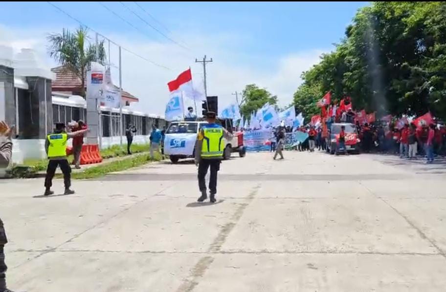Selama orasi berlangsung di depan kantor KPT, personel pengamanan membentuk barikade yang humanis namun tegas, memfasilitasi buruh menyuarakan tuntutan mereka, di antaranya kenaikan UMK menjadi Rp 3,5 juta dan penghapusan outsourcing.