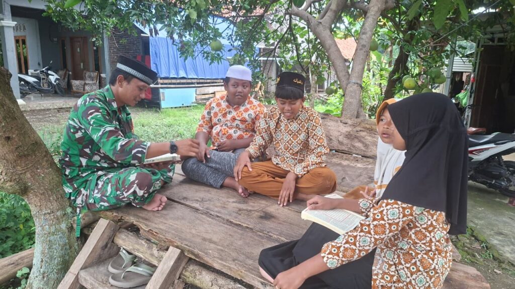 Mengenakan seragam loreng kebanggaannya, Serka Feri tampak telaten membimbing jari-jemari mungil anak-anak menelusuri huruf demi huruf hijaiyah. Suasana hangat menyelimuti kegiatan yang berlangsung sederhana namun penuh khidmat tersebut.