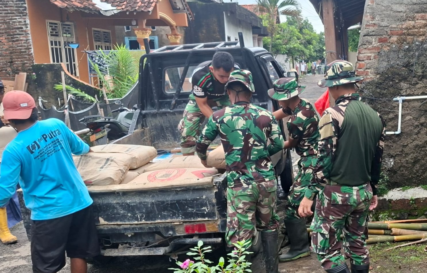Pemandangan menghangatkan hati terlihat di lokasi pembangunan Rumah Tidak Layak Huni (RTLH). Di bawah terik matahari, Pratu Agung Yunianto dan Prada Dwi Laksono tampak kompak bersama Bapak Mulsa (55), warga setempat, bahu-membahu mengangkat karung semen untuk material bangunan.
